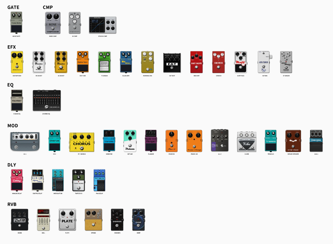 效果模組:GATE雜訊門、CMP壓縮、EFX超載類、EQ均衡、MOD周邊、DLY延時、RVB殘響