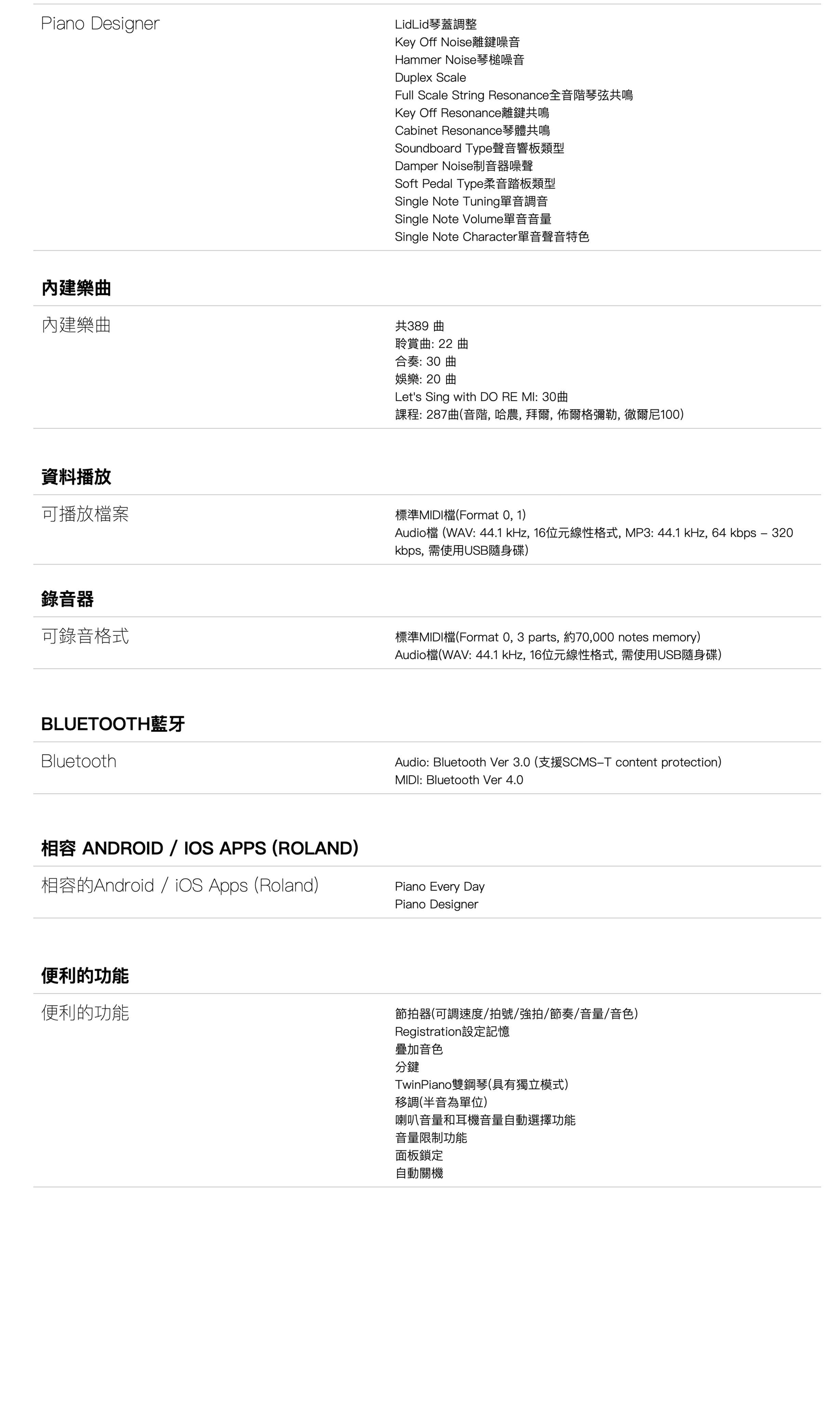 · Roland的PureAcoustic Piano Modeling技術,提供真實的傳統鋼琴音色