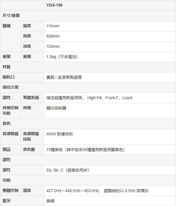 YDS-150 使用由Yamaha傳統薩克斯風所取樣的音色,從高音(Soprano)、中音(Alto)、次中音(Tenor)及上低音(Baritone),和專業演奏者共同合作,並完整錄製每個音階而成,讓您盡情地享受樂器演奏的樂趣,不被非原聲取樣的音色所影響。